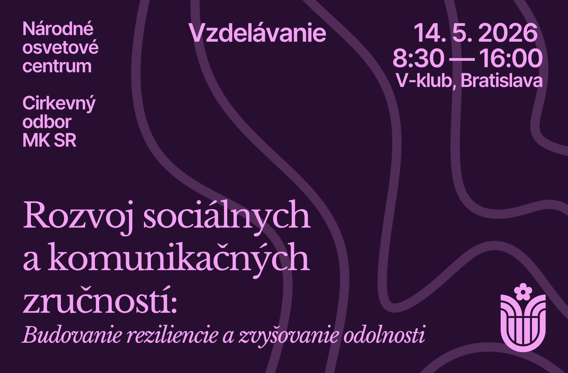 NOC v spolupráci s Cirkevným odborom Ministerstva kultúry SR vás pozýva na ďalšie pokračovanie vzdelávania Rozvoj sociálnych a komunikačných zručností pracovníkov v rezorte kultúry, s tematickým zameraním Budovanie reziliencie a zvyšovanie odolnosti.